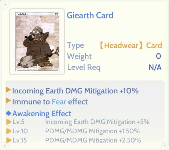 Giearth Card reduces your Earth damage taken by 10%