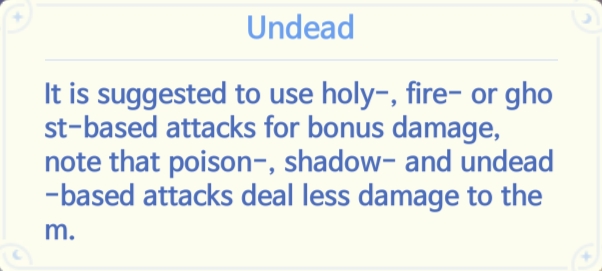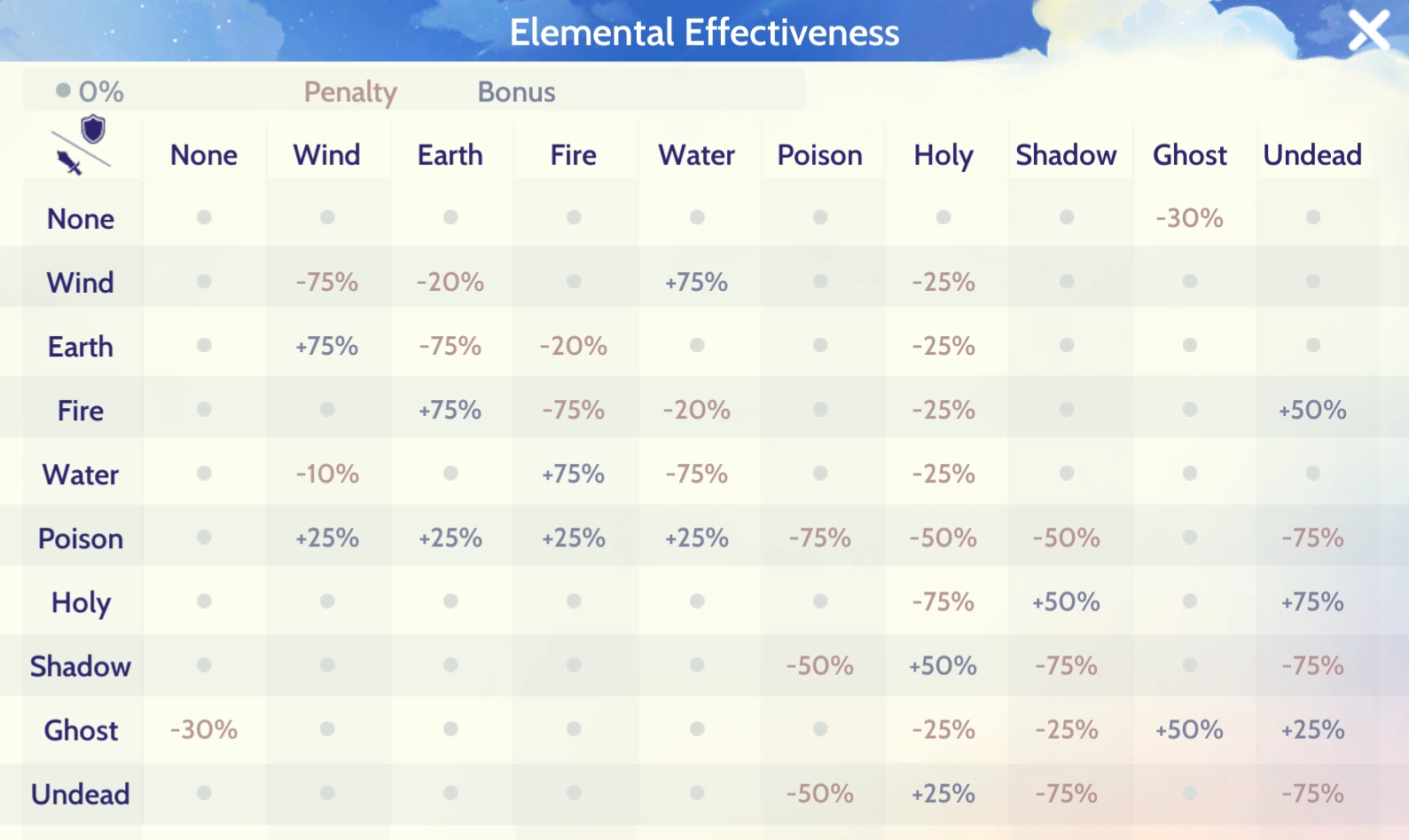 There are ten different elements: Neutral, Water, Earth, Fire, Wind, Poison, Holy, Shadow, Ghost, and Undead.