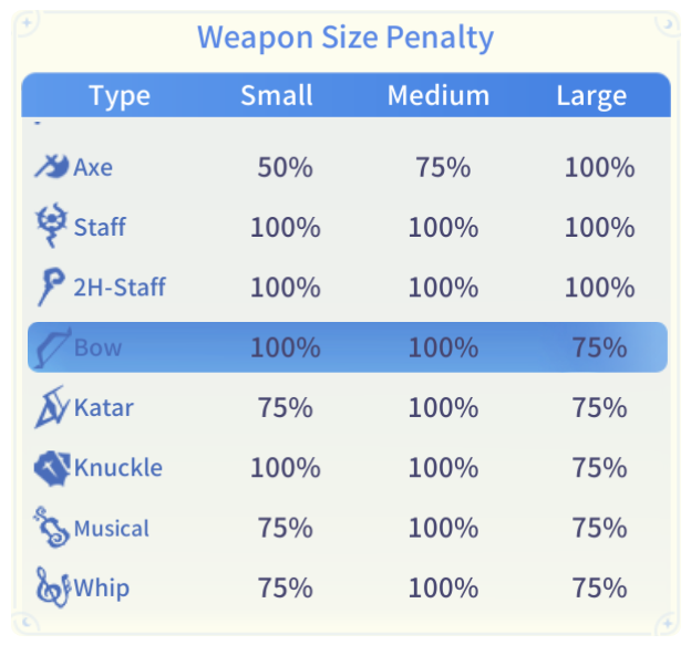 Upon job advancing to Archer in Payon, it is advised to put all your stat points into DEX for stronger ranged attacks or into AGI for a faster attack speed. Double Strafe is also recommended for taking, as it is a great skill for leveling in the early game. Also, a bow is an effective weapon against small/medium monsters.Bow effectiveness against monsters of different sizes: