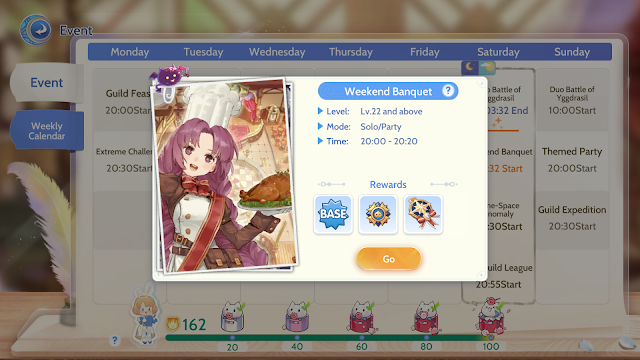 The regular Guild Feasts go live on weekdays and the Weekend Banquet goes live on Saturdays at 20:00 to 20:20 server time.