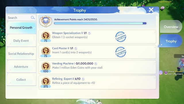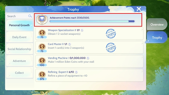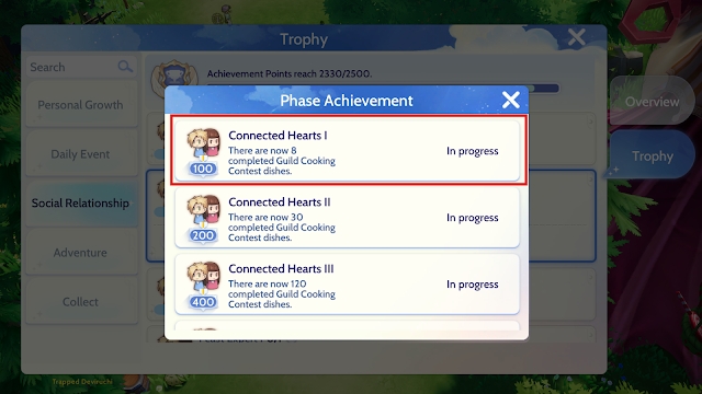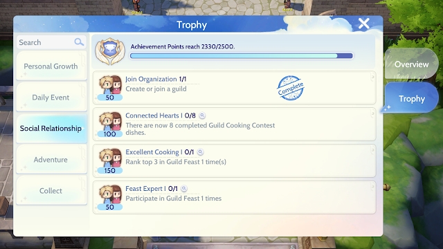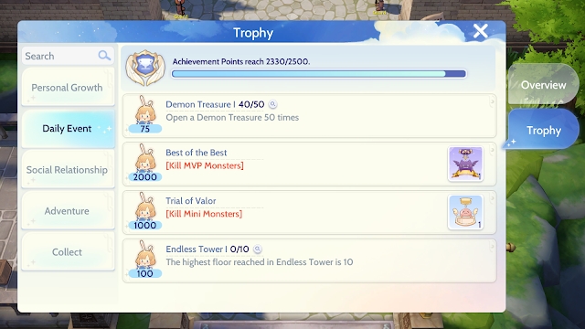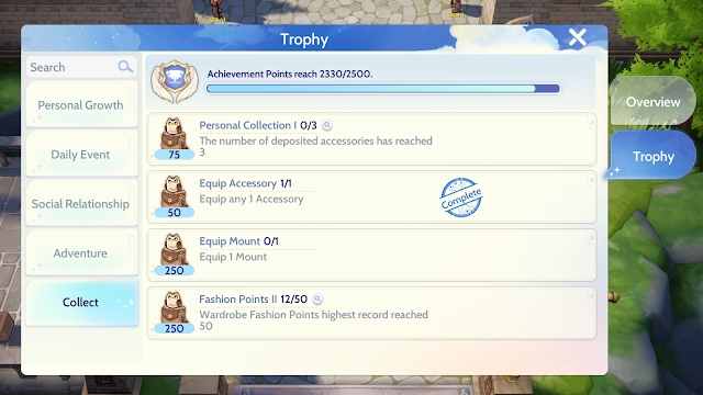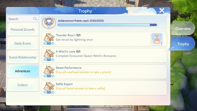 Trophies are categorized into five sections: personal growth, daily events, social, adventure, and collection.