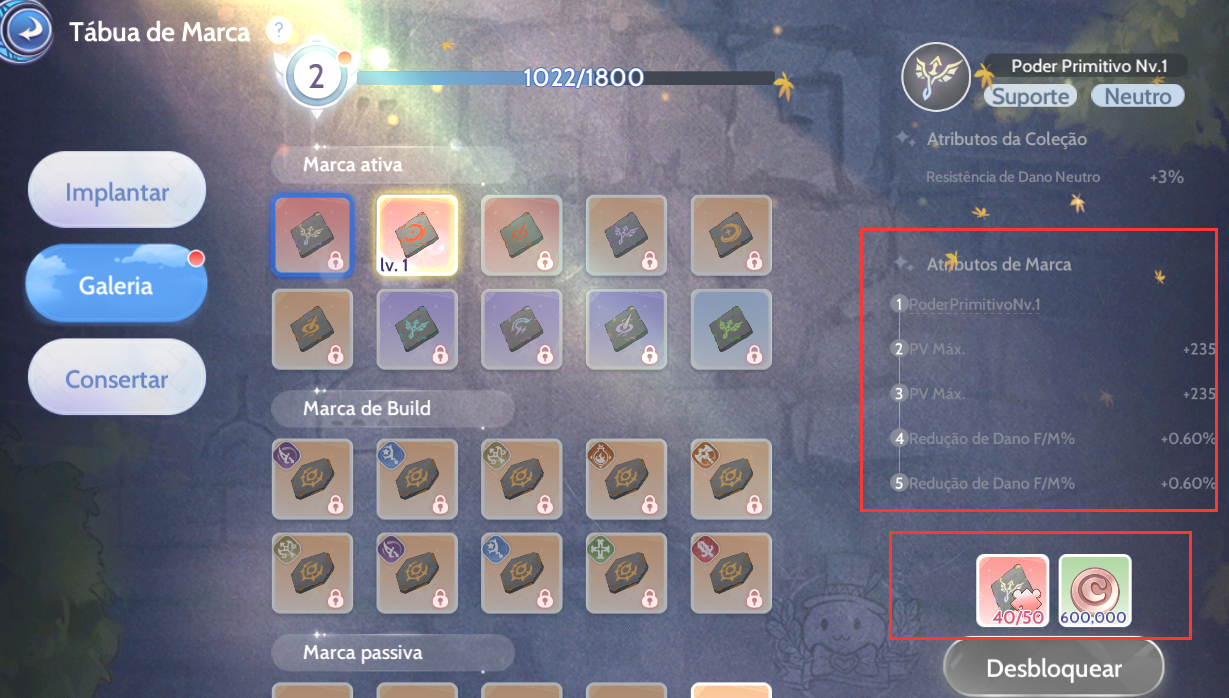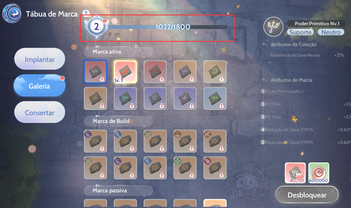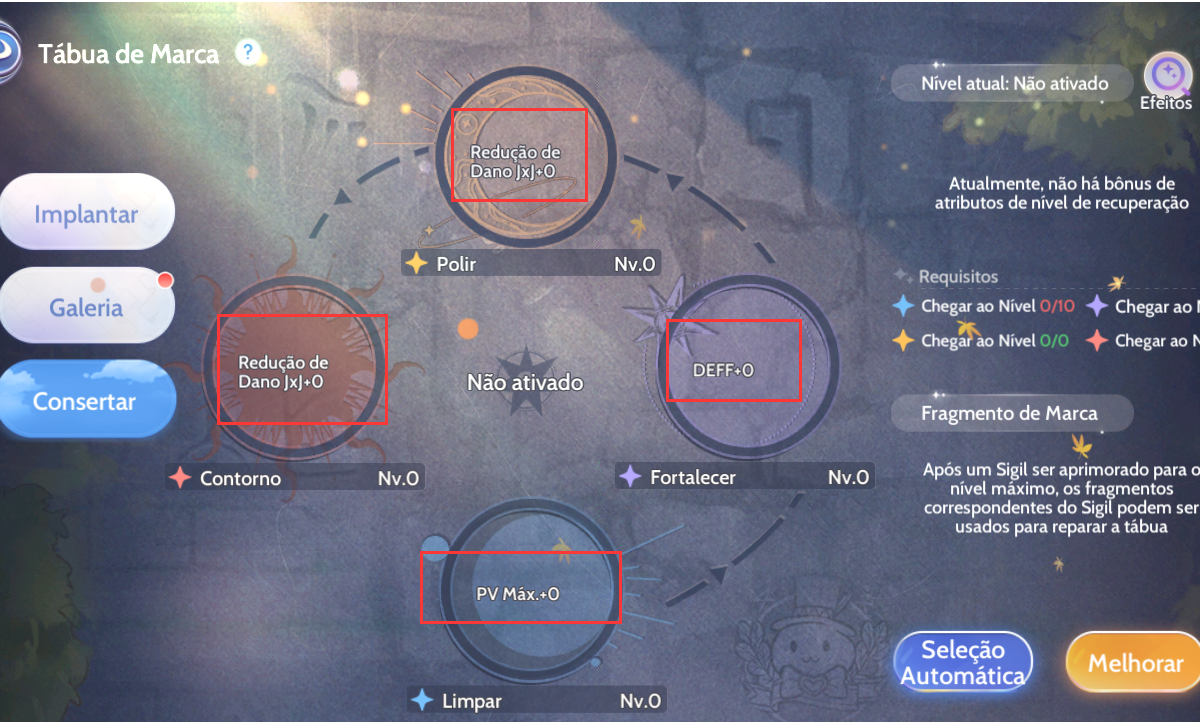 Você pode usar fragmentos de selo do mesmo nome e Moedas do Éden para aumentar o nível de um selo específico. Você ganhará os atributos adicionais para cada nível aprimorado.