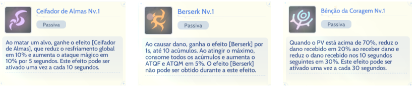 Eles também são divididos em 3 tipos de Habilidades, além do Selo do Mundo Congelado. Temos Poder Antigo, Luz do Guardião e Espada Divina. Existem também 3 níveis de habilidade que aumentam o efeito da habilidade dependendo da cor (Vermelho, Amarelo, Roxo e Azul).